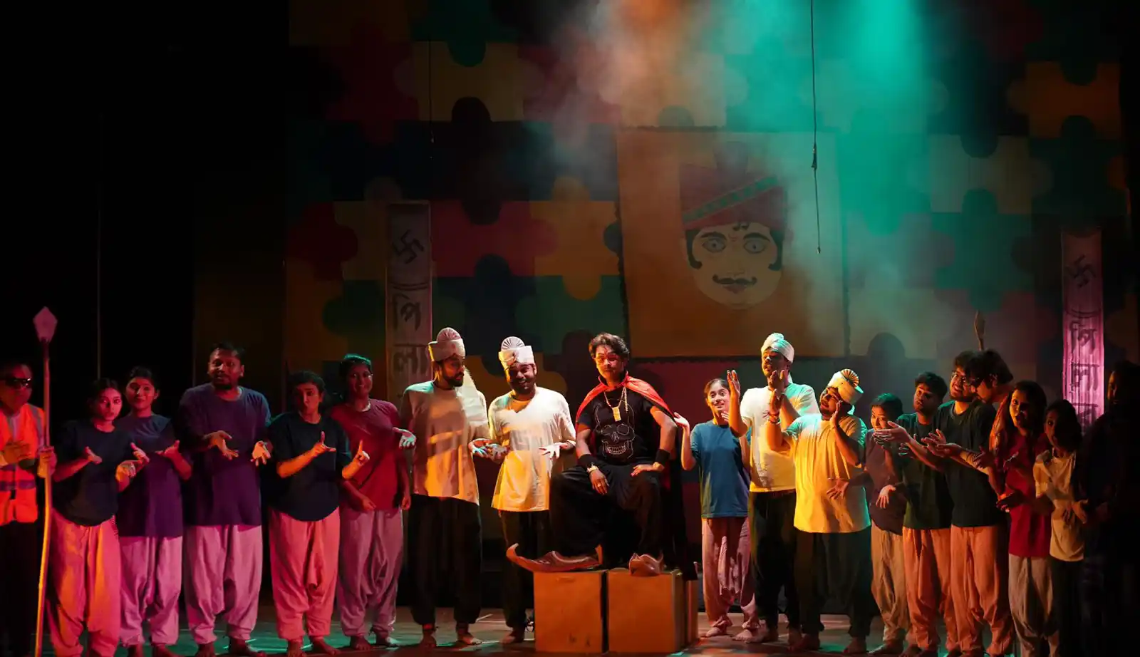 এই শানিত সংলাপের ঠিক সমান্তরালেই এই রাজনৈতিক স্যাটায়ারের অন্যতম শক্তিশালী মেটাফর হয়ে ওঠে এর কোরাস এবং লাইভ মিউজিকের ব্যবহার। শর্মিলার অসামান্য কোরিওগ্রাফিতে কোরাস দল যখন মঞ্চের ওপর সুনির্দিষ্ট জ্যামিতিক আকার তৈরি করে, তখন তা কেবল দৃষ্টিনন্দন শারীরিক বিন্যাস থাকে না; বরং তা এক দলবদ্ধ জনসমুদ্রের অমোঘ রূপক হয়ে ওঠে। এই কোরাস কখনও শাসকের ইশারায় ওঠা-বসা করা মগজধোলাই হওয়া দাস, আবার পরক্ষণেই তারা ফেটে পড়া বিক্ষুব্ধ জনতা। সৈকত মান্নার আলোকসম্পাত মঞ্চের এই আলো-আঁধারির দ্বান্দ্বিক রূপটিকে, ক্ষমতার এই মনস্তাত্ত্বিক জ্যামিতিকে আরও প্রখর করে তোলে।