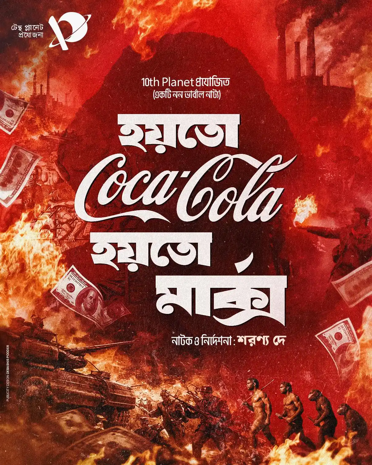 প্রমিথিউসের আগুন থেকে কর্পোরেট ক্যাকোফনি—10th Planet প্রযোজিত নির্বাক নাটক ‘হয়তো Coca-cola হয়তো মার্ক্স’-এ উন্মোচিত হয় সভ্যতার এক নির্মম বিবর্তন। এই নাটকের বিশ্লেষণে পুঁজিবাদ, সাম্রাজ্যবাদ, ফ্যাসিবাদ ও বামপন্থার সংকট এক তীক্ষ্ণ নৈঃশব্দ্যে ধরা পড়ে। দর্শক এখানে কেবল সাক্ষী নয়, নিজেরই আদর্শগত ভাঙনের কাঠগড়ায় দাঁড়ানো এক অভিযুক্ত সত্তা। লিখলেন সায়ন দত্ত।